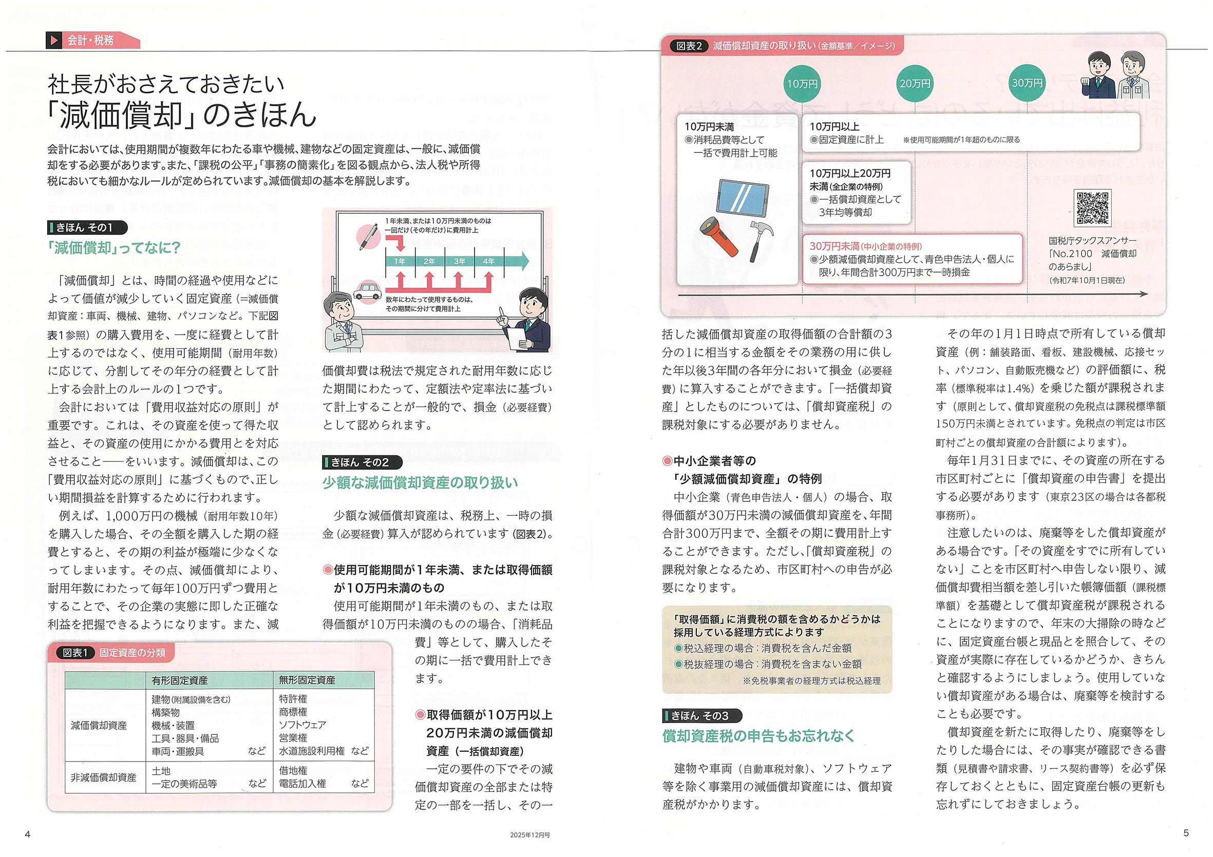 会社においては、使用期間が複数年にわたる車や機械、建物などの固定資産は、一般に、減価償却をする必要があります。また、「課税の公平」「事務の簡素化」を図る観点から、法人税や所得税においても細かなルールが定められています。減価償却の基本を解説します。